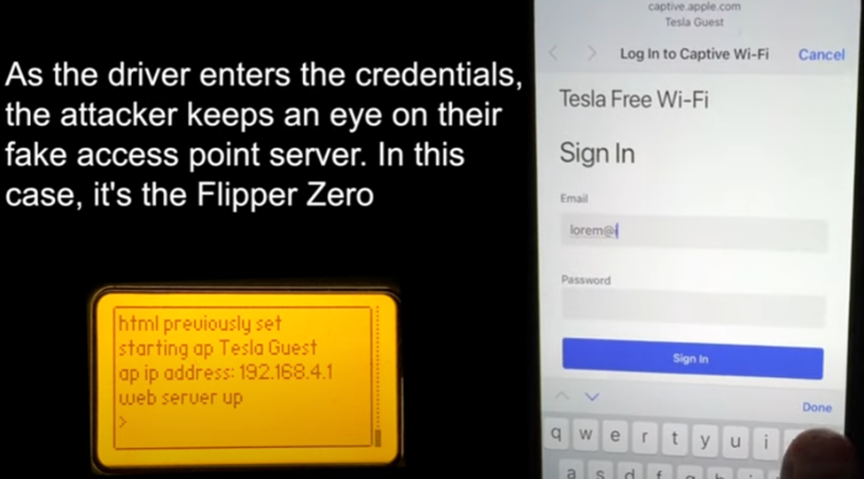 Upon connecting to the deceptive network, users are prompted to input their account credentials on a fake Tesla login screen. Any data entered on this phishing website is instantly accessible to the attacker via the Flipper Zero device.